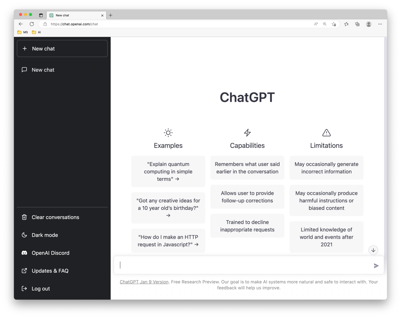 여기서는 간단하게 ChatGPT를 사용하는 방법에 대해 알아보겠다. ChatGPT를 사용하기 위해 https://chat.openai.com/ 에 접속하자. 'Sign up'를 선택해 가입을 완료하면 아래와 같은 화면이 뜬다.