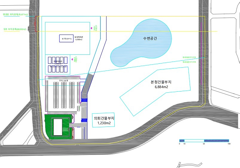 둘째, 이러한 두 개의 문화체육시설을 건립하기 위해 신청사 건립 예정부지는 당초 68,000㎡에서 78,000㎡로 10,000㎡ 확대되고 반면에 매각대상 유휴부지는 당초 90,000㎡에서 80,000㎡로 10,000㎡ 축소된다. 이는 전임시장 시절 추진된 신청사 건립계획의 부지면적과 동일하다.
