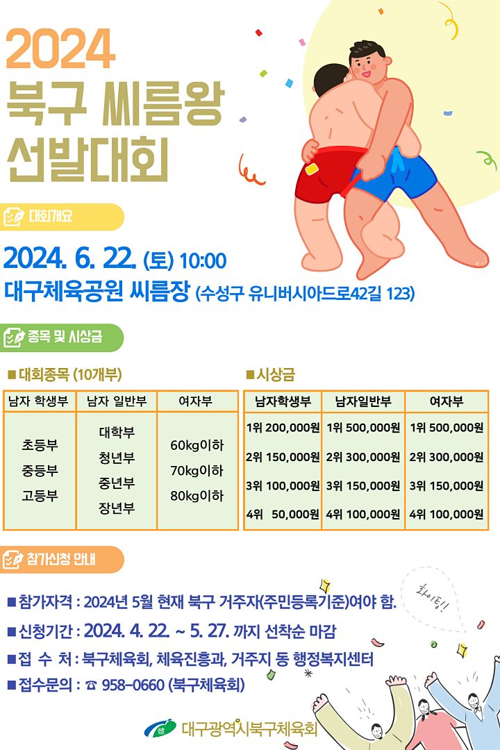 2024년 대구 북구 씨름왕 선발대회가 6월 22일(토) 대구체육공원 씨름장(대구스타디움 암벽등반장 앞)에서 개최되며, 참가선수 신청은 4월 22일부터 5월 27일까지 접수한다.