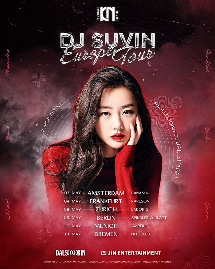달수빈(DJ SUVIN)은 오는 5월 3일부터 11일까지 독일 브레멘, 베를린, 뮌헨, 스위스 취리히, 프랑크푸르트, 네덜란드 암스테르담까지 유럽 6개 도시에서 클럽 투어에 나선다. DJ 활동을 시작한지 약 8개월 만에 투어로 활동 영역을 빠르게 넓히고 있다.