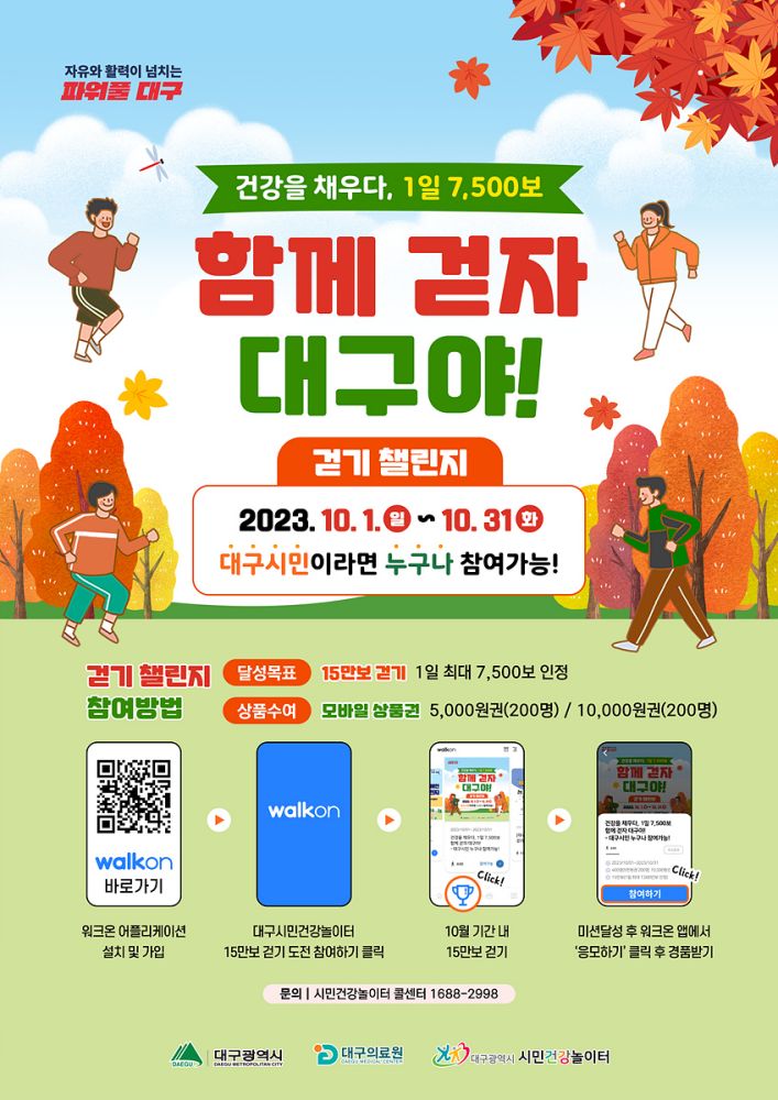 대구광역시 시민건강놀이터에서는 대구시민의 일상생활 속 신체활동 활성화 및 걷기 실천을 장려하고자 10월 1일부터 31일까지 모바일 걷기앱(워크온)을 활용한 2023년 하반기 ‘건강을 채우다. 1일 7,500보’ 함께 걷자, 대구야! 걷기챌린지를 운영한다.