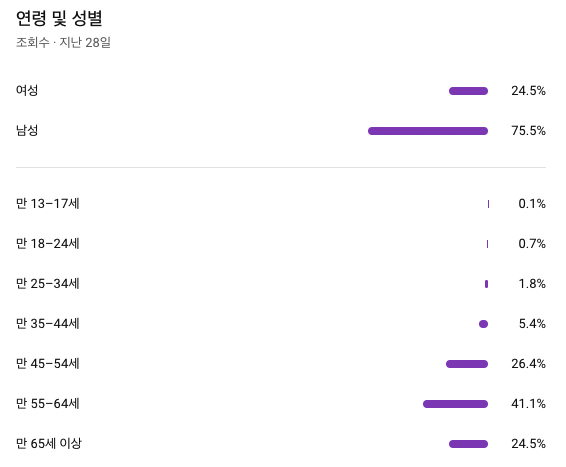 참고로 해당 유튜브 채널의 시청자층은 남성:여성의 비율이 75:25로 남성이 많은 편이고, 연령대 비율은 45-55세 26%, 55-64세 41%, 65세 이상 24%로 45세 이상 중장년층의 비율이 압도적으로 높은 편이다.