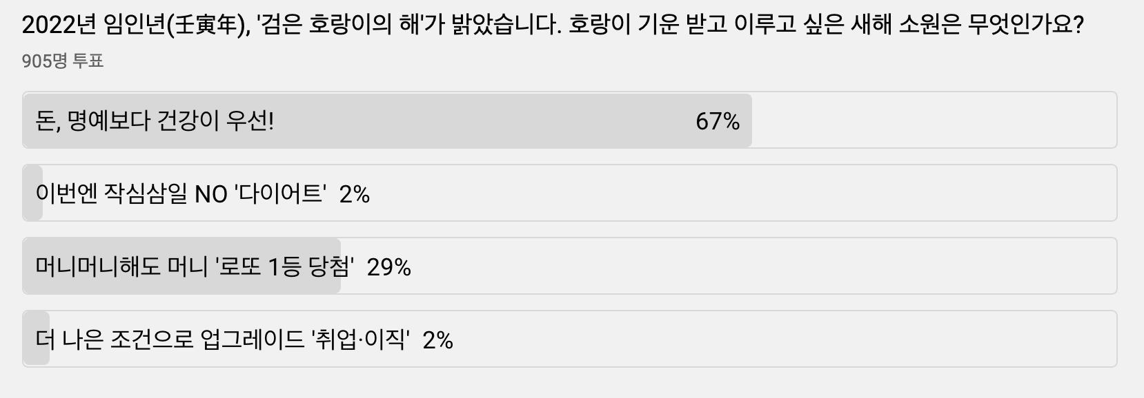 총 905명이 투표에 참여한 결과 임인년 가장 이루고 싶은 새해 소원은 '돈, 명예보다 건강이 우선!'으로 나타났다. 무려 67%가 넘는 이들이 선택했으며 '로또 1등 당첨'이 29%로 2위를 차지했다. '다이어트', '취업이직'은 각각 2%로 많은 선택을 받지 못했다.