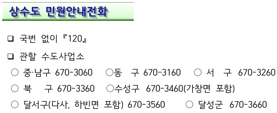 대구시 상수도사업본부는 12월 25일 ~ 28일 기간 중 계량기 동파로 인한 시민불편을 최소화하기 위해 비상근무 실시로 계량기 교체 등에 신속히 대처할 예정이다.