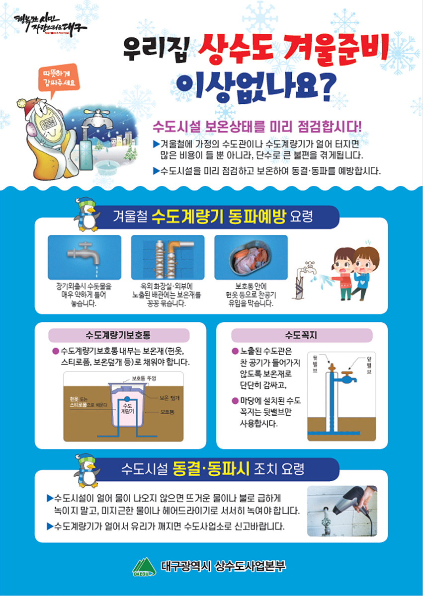 대구시 상수도사업본부는 12월 25일 ~ 28일 기간 중 기온이 영하 5~10℃까지 내려갈 것이라는 기상관측에 따라 수도계량기 동파 예방을 위해 보온조치를 당부했다.