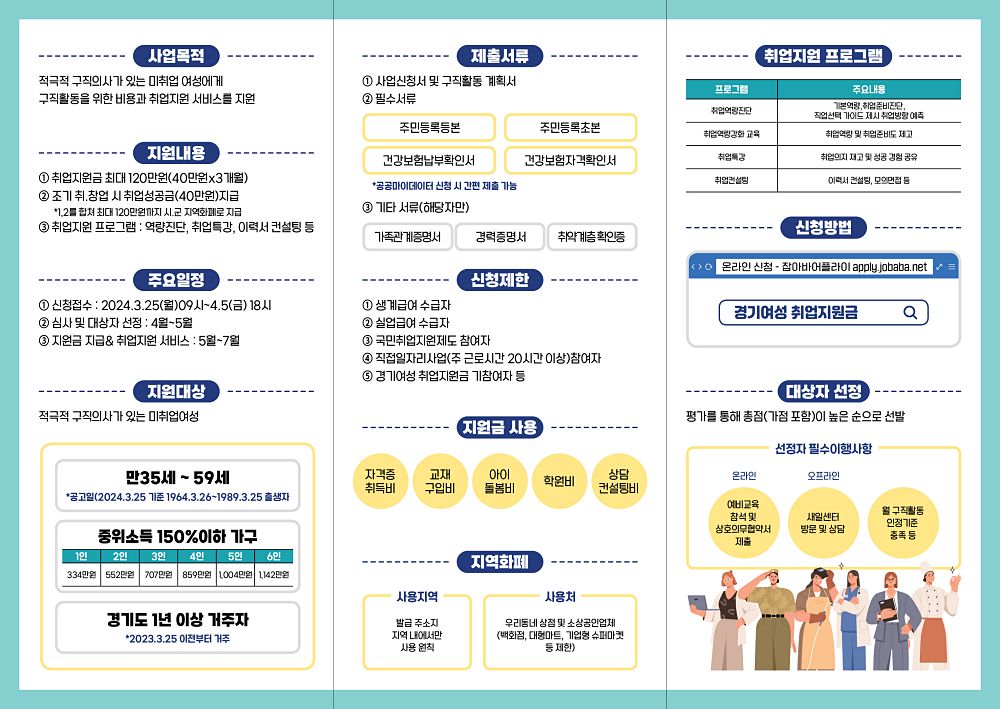 지원 자격은 적극적인 구직의사가 있는 35~59세 여성 중 경기도 거주기간이 1년 이상이고, 중위소득 150% 이하인 가구의 미취업 여성이다. 도는 올해부터 지원 대상 조건 중 중위소득을 100% 이하에서 150% 이하까지로 확대했다.