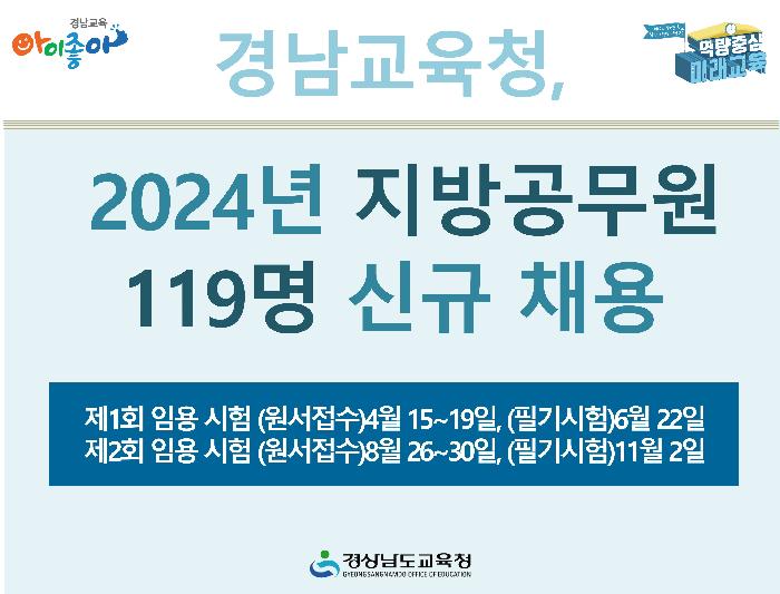 경상남도교육청은 올해 8개 직렬에서 지방공무원 119명을 신규 채용한다.