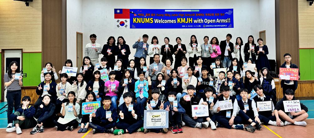 4월 10일(목)에는 학생, 학부모, 교직원들이 대만 광명중의 방문단을 환영하는 자리를 마련하여, 교장과 대표 학생들의 환영사를 시작으로 가야금, 오케스트라, K-POP 댄스 등 축하 공연과 한국어·대만어 구호 만들기 프로그램을 진행하였다.