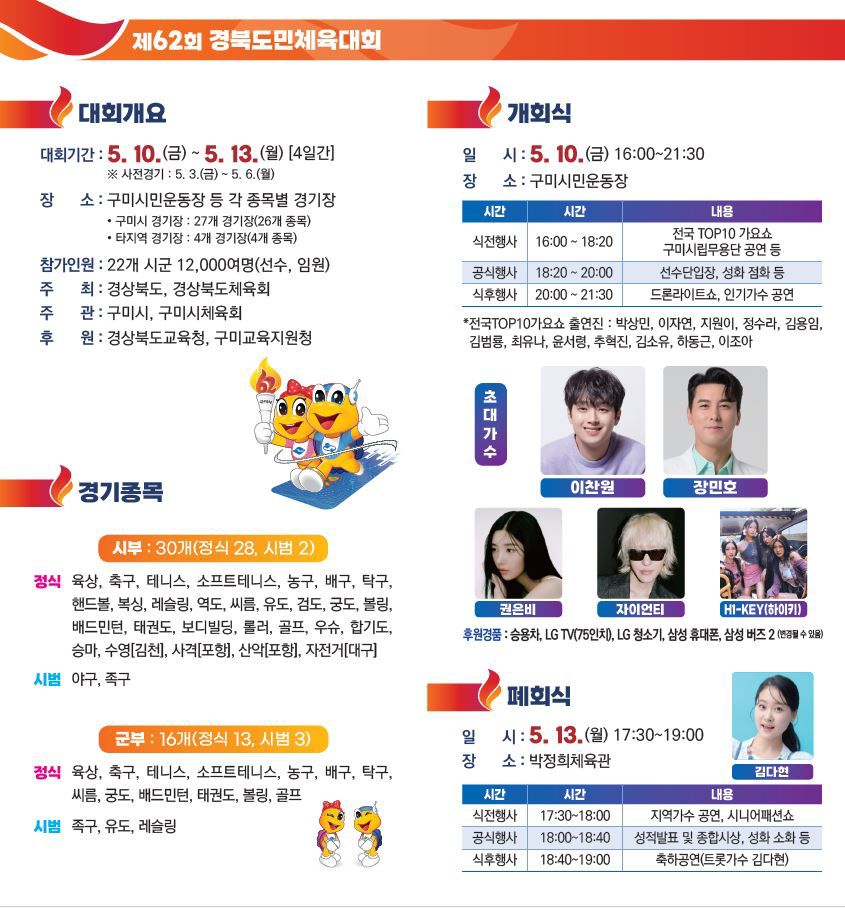 한편, 제62회 경북도민체육대회는 5월 10일부터 13일까지 4일간 구미시민운동장 등 종목별 경기장에서 개최되며, 22개 시‧군이 30개 종목에 참가한다.