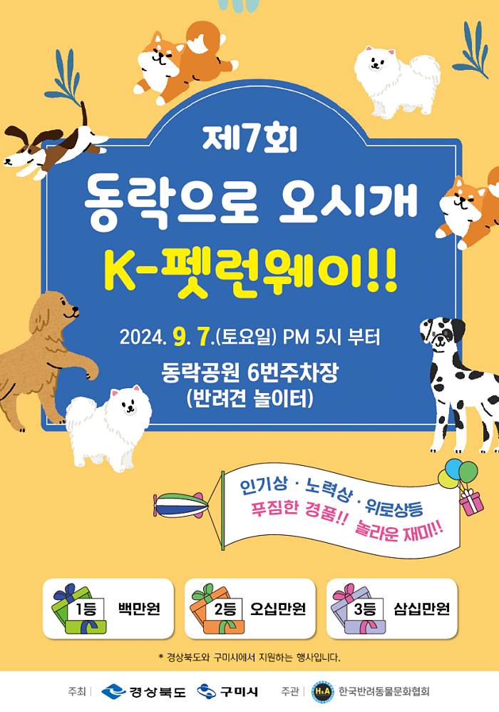같은 날, 구미시 동락공원에서도 ‘제7회 동락으로 오시개(K-펫 런웨이!)’를 개최하며 반려 가족 런웨이 선발대회, 반려동물 간식 만들기, 미니운동회 등 체험행사, 무료 건강검진, 미용 상담, 유기 동물 입양캠페인 등 다양한 행사를 진행할 예정이다.