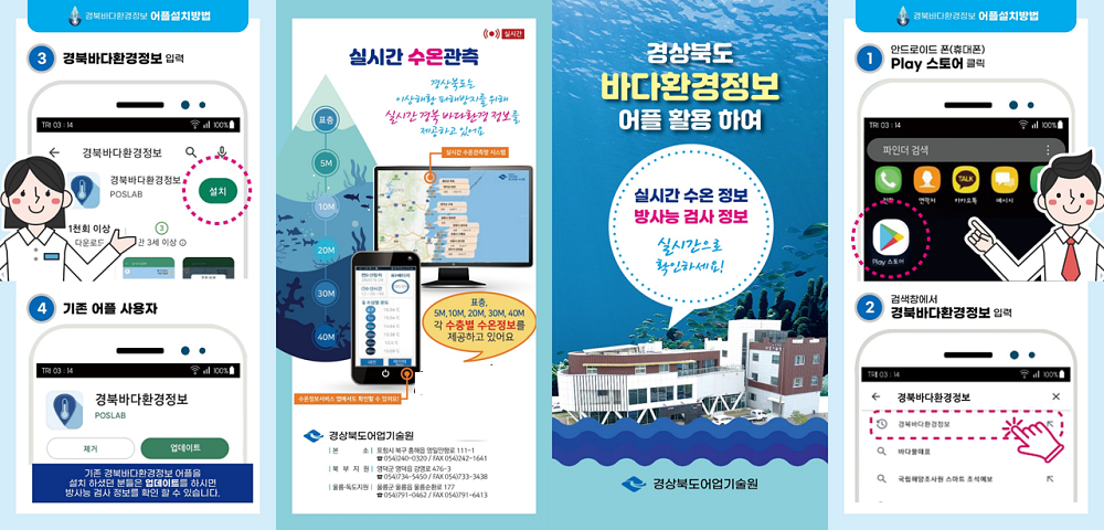 경북바다환경정보 앱은 구글 Play스토어에 검색해 내려 받을 수 있고 기존 앱 사용자는 업데이트를 통해 방사능 검사 정보를 확인할 수 있다. 경북도는 모든 연령대가 쉽게 사용할 수 있도록 앱 관련 상세 안내 리플릿을 제작 배포할 계획이다.