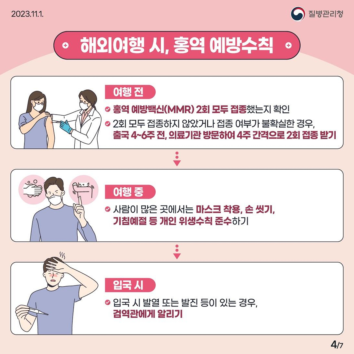 이를 위해 의료기관의 홍역 조기인지 및 신속한 신고로 홍역 발생 감시를 강화하고, 외국인 유학생 및 외국인 노동자, 다문화가정 등을 대상으로 다국어 번역 홍보물을 배포하는 등 홍역 예방수칙을 홍보했다. 또한, 접종 미완료자를 대상으로 예방접종 독려를 적극 추진할 예정이다.