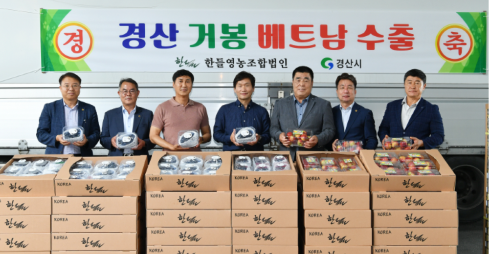 이번 수출을 주도한 한들영농조합법인(대표 김정웅)은 14일 조현일 경산시장, 경산시의원, 생산 농가 대표 및 경산시 관계자 등 30여 명이 참석한 가운데 수출 선적식을 가졌다. 그 후 거봉포도 1,200kg을 베트남 항공편 선적을 위해 인천공항으로 실어 보냈다.