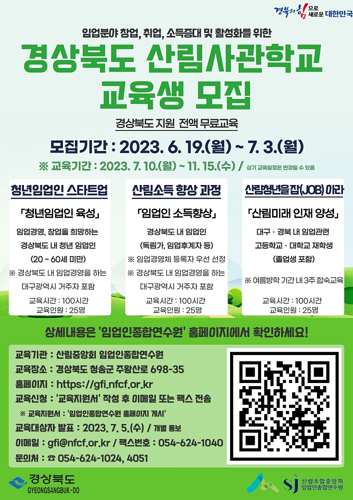 경북도는 전문 임업인 양성을 통한 임업분야의 창업, 취업, 소득 증대 및 활성화를 위해 ‘2023년 제1기 경상북도 산림사관학교’ 교육생을 모집한다. 경상북도 산림사관학교는 미래 임업 산림인재 양성을 위해 경북도에서 올해 처음으로 시작하는 사업이다.