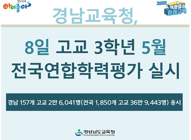경상남도교육청은 8일 전국 동시에 실시하는 고등학교 3학년 5월 전국연합학력평가에 도내 157개 고교, 학생 2만 6,041명(전국 1,850개 고교, 36만 9,443명)이 응시한다고 밝혔다.