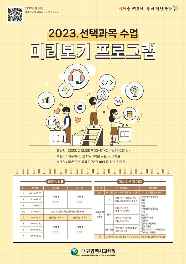 대구시교육청은 7월 31일(월)부터 8월 1일(화)까지 2일간 대구여고에서 대구지역 일반고 학생 487명을 대상으로 ‘선택과목 수업 미리보기 프로그램’을 운영한다.