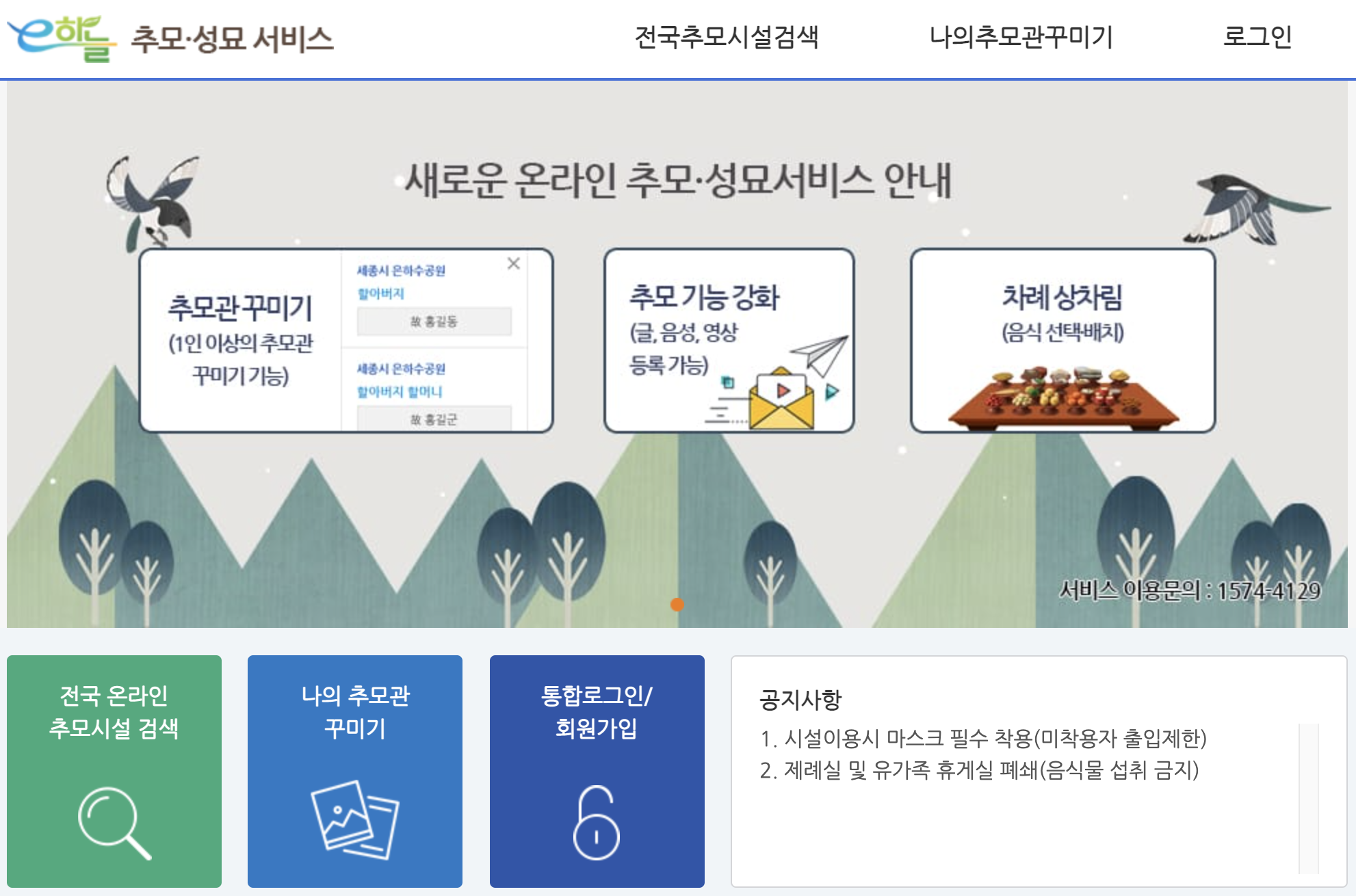 *e하늘장사정보시스템: 보건복지부(한국장례문화진흥원)에서 운영하는 장사문화 및 시설 등 정보제공 시스템으로 사전 접수 시, 장사시설에서 고인의 사진이나 봉안함을 찍어 온라인 차례상에 올리고, 가족들은 추석 온라인 차례상에 헌화, 분향할 수 있으며 추모글 등을 작성해 고인을 추모할 수 있다.