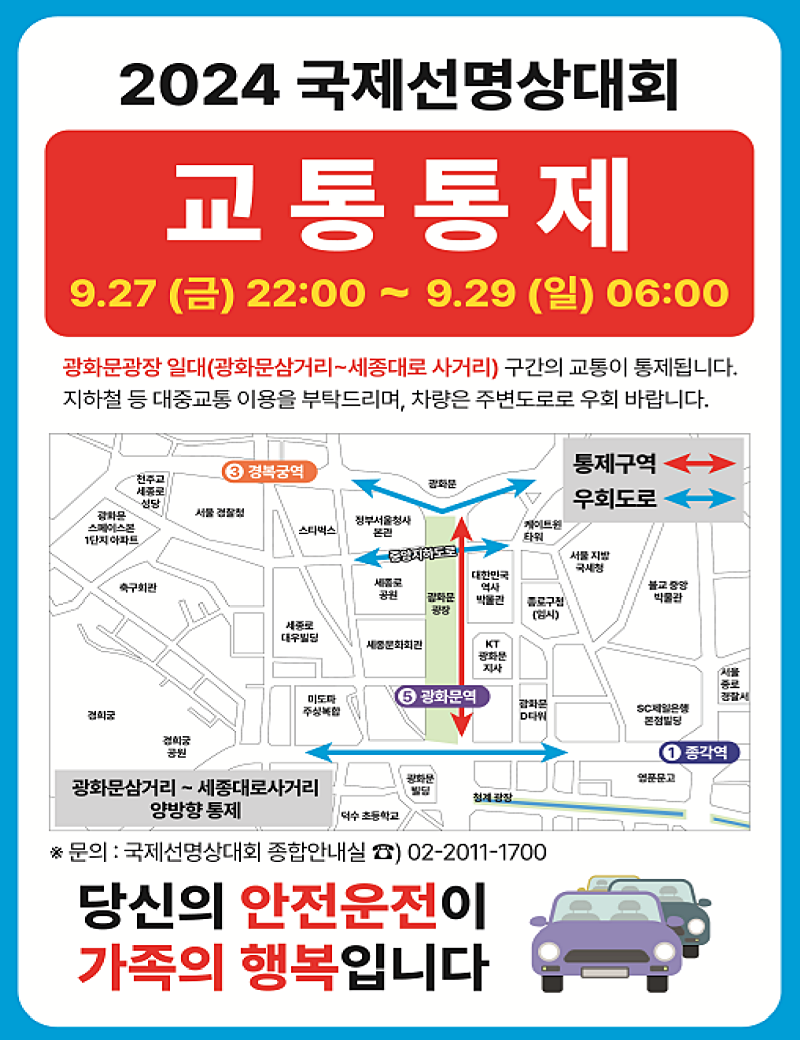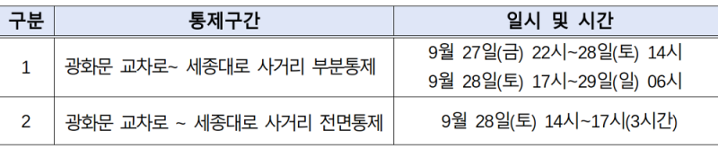 행사의 원활한 진행을 위해 27일(금) 22시부터 29일(일) 06시까지 세종대로(광화문교차로~세종대로 사거리) 구간의 교통이 통제된다.