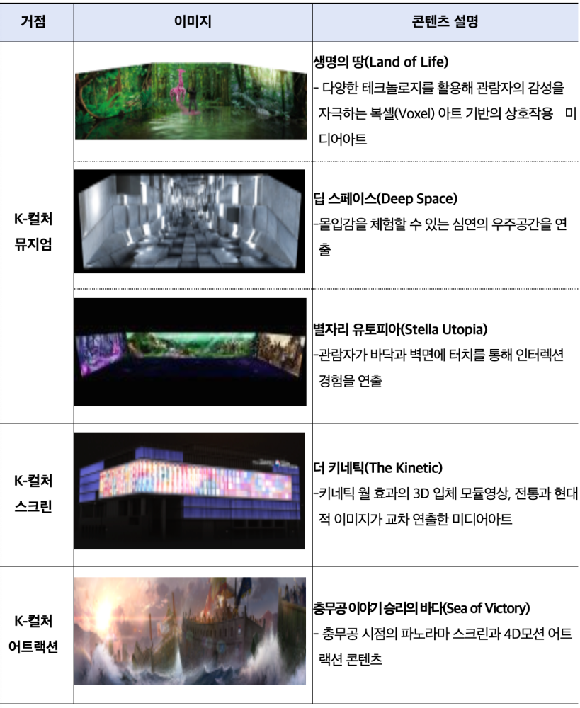 ‘K-컬처 스크린’에서는 ‘움직이는 예술’인 키네틱(Kinetic) 아트를 바탕으로 한국의 전통적 아름다움과 현대적인 이미지가 교차되는 순간의 역동성을 표현한 ‘더 키네틱(The Kinetic)’을 공개한다. ‘K-컬처 어트랙션’에서는 임진왜란을 주제로 한 ‘충무공 이야기 승리의 바다(Sea of Victory)’를 통해 4차원 움직임 의자(모션체어)를 타고 해상전투의 현장을 실감 나게 체험할 수 있다.