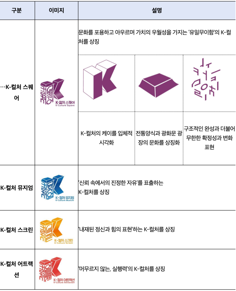 새로운 브랜드 디자인은 ‘K-컬처’의 ‘K’를 강조하고, 기본색인 보라색으로 K-컬처의 ‘유일무이한 가치’를 표현했다. 창의성의 근간인 ‘자유’의 파란색과 ‘내재된 정신과 힘’의 의미를 표현한 노란색, ‘실행력’을 상징하는 붉은색으로 디자인을 변환해 다양성과 역동성으로 발전해 온 ‘K-컬처’를 입체적으로 시각화했다.