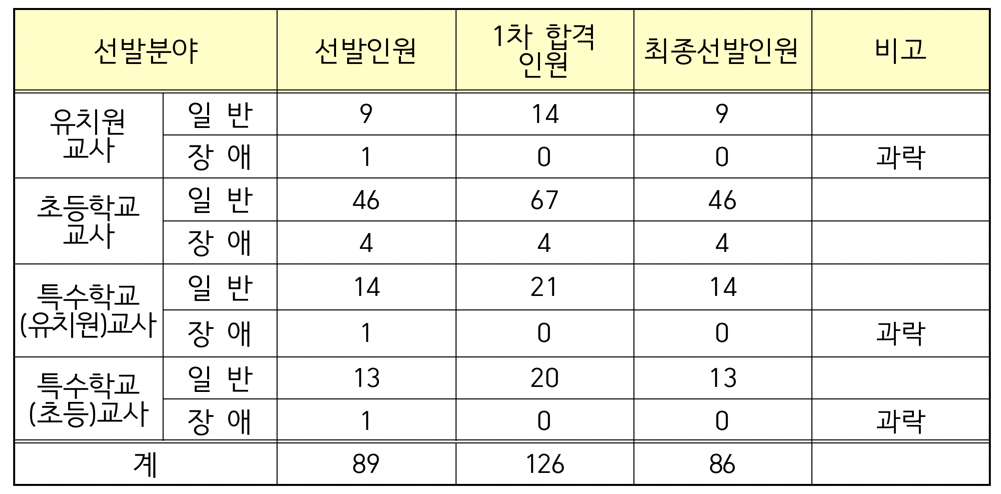 1차 시험 합격인원은 모집정원[유치원 10명, 초등학교 50명, 특수학교(유치원) 15명, 특수학교(초등) 14명 총 89명]의 1.5배이며 유치원 14명, 초등학교 71명, 특수학교(유치원) 21명, 특수학교(초등) 20명 총 126명이 합격됐다.