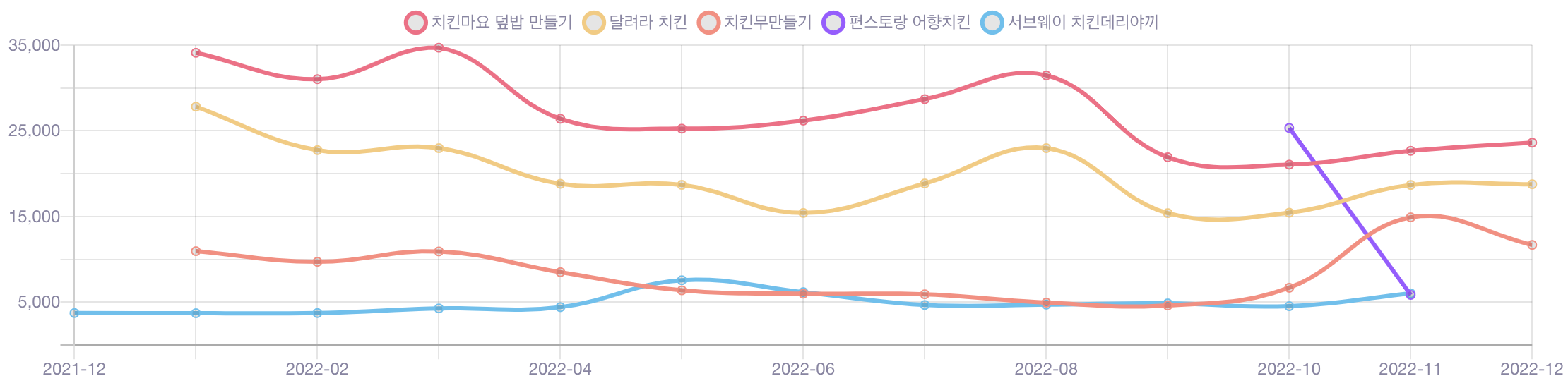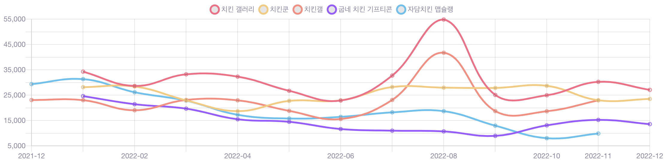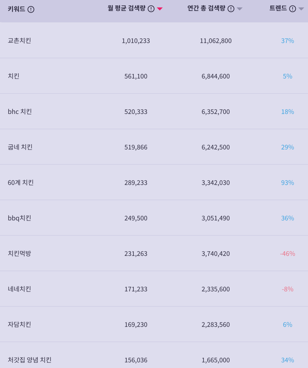 그리고 무엇보다 '교촌치킨'의 검색량이 '치킨' 검색량을 압도하는 것을 확인 할 수 있는데, 일반명사인 '치킨'보다 브랜드명을 사용해 검색하는 이들이 많기 때문으로 보인다. 이를 통해 교촌치킨의 인기가 어느 정도인지도 가늠할 수 있다.