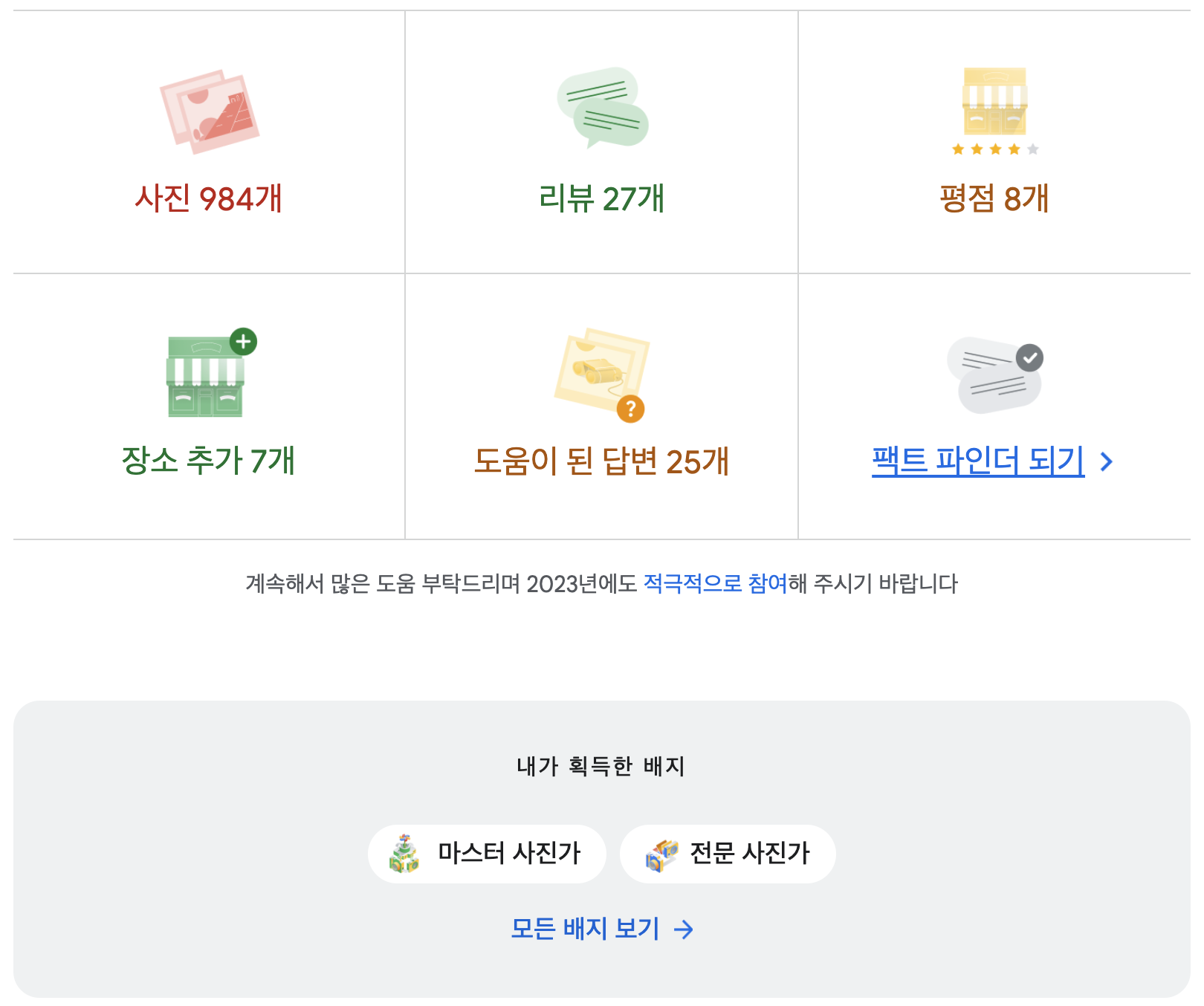 사진은 모두 984개, 리뷰는 27개, 평점은 8개, 장소 추가 7개, 도움이 된 답변은 25개로 나온다. 리뷰나 평점보다는 구글 맵 사용자들이 시각적으로 정보를 확인 할 수 있도록 DSLR로 촬영한 고화질 사진을 올리는데 주력했는데 그대로 확인할 수 있었다. 그 결과 전문 사진가와 마스터 사진가 배지를 획득할 수 있었다.