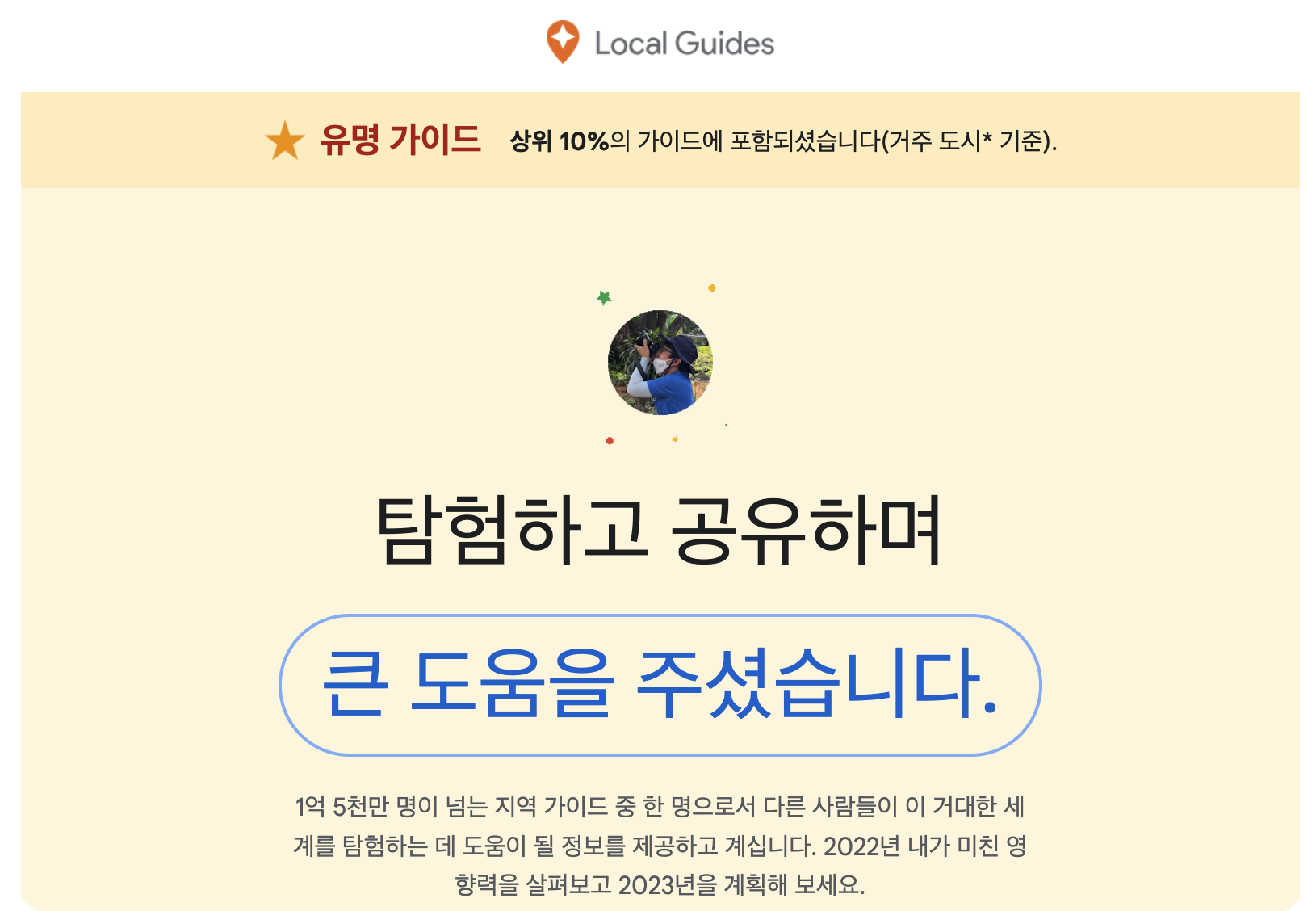 구글 지역 가이드(Local Guides)로부터 메일이 한통 왔다. 1억 5천만명이 넘는 지역 가이드 중 상위 10%의 가이드에 포함되었다는 소식이었다. 지난 해 열심히 지역가이드 활동했는데 어느 정도 성과를 낸 듯 하다.