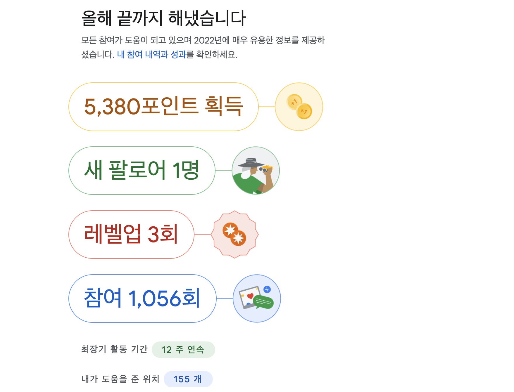 메일에는 2022년 어떤 성과를 냈는지도 자세히 나와있다. 총 5380 포인트를 획득했고 새 팔로어는 1명, 레벨업은 3회, 총 참여횟수는 1056회, 내가 도움을 준 위치는 155개라고 한다.