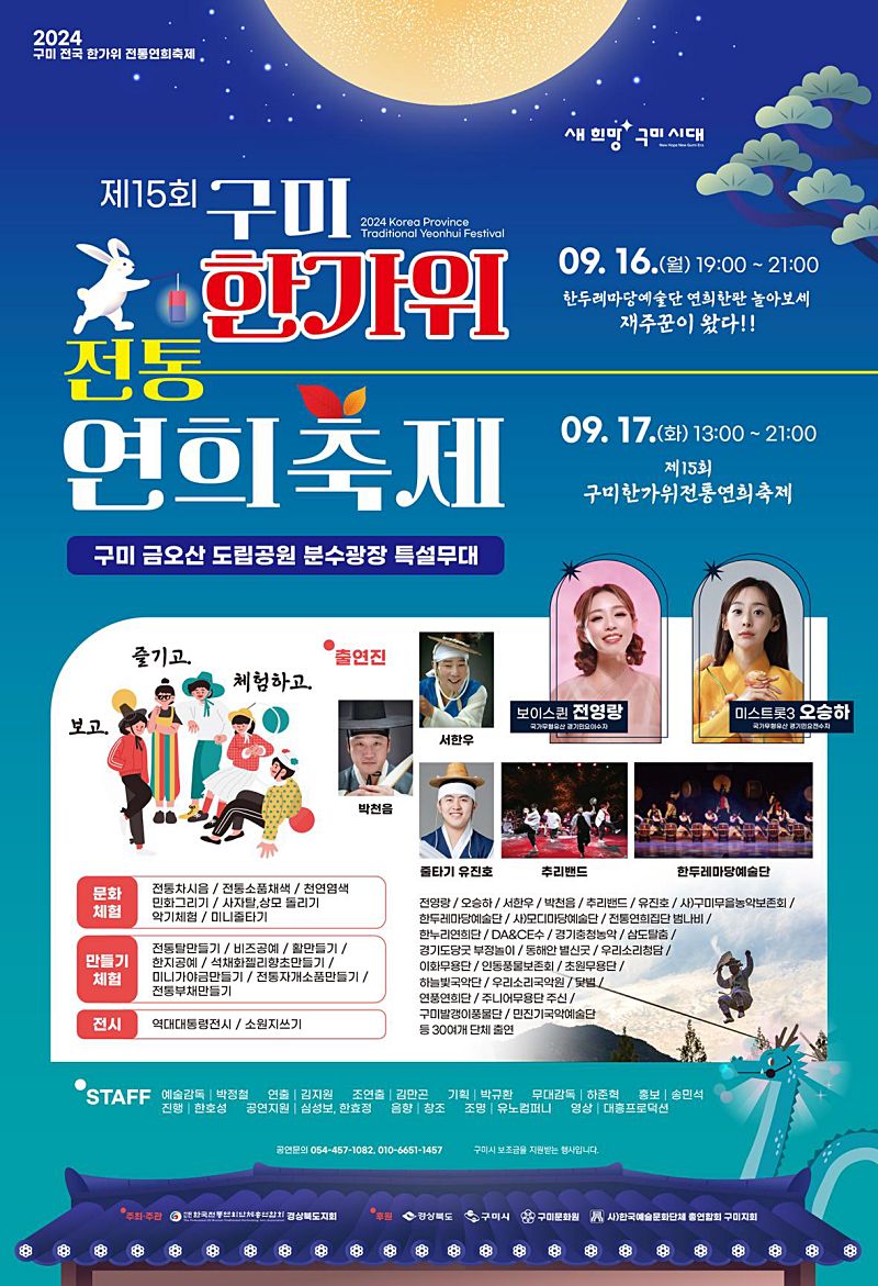구미시는 (사)한국전통연희단체총연합회 경상북도지회가 주관하고, 경상북도와 구미시가 후원하는 「제15회 한가위 전통연희축제」를 16일부터 17일까지 구미 금오산도립공원 분수광장 특설무대에서 개최한다.