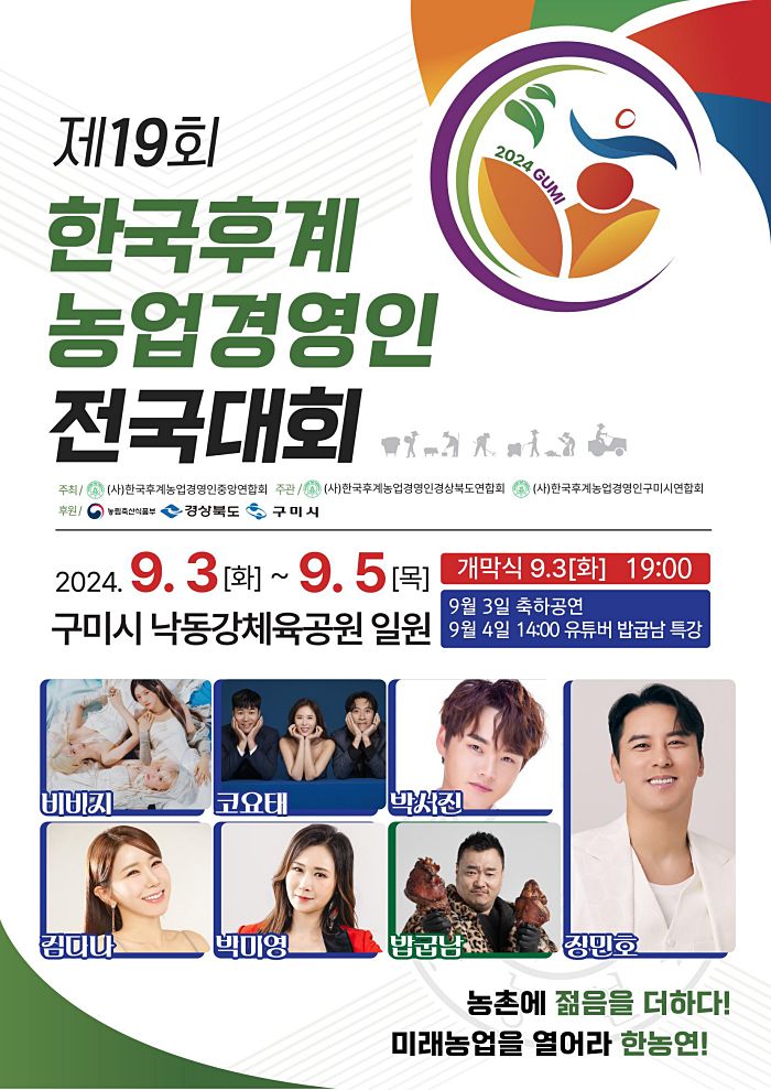 구미시는 3일부터 5일까지 낙동강체육공원 일원에서 (사)한국후계농업경영인중앙연합회 주최, 경상북도연합회 및 구미시연합회 주관으로 제19회 한국후계농업경영인 전국대회를 개최한다.