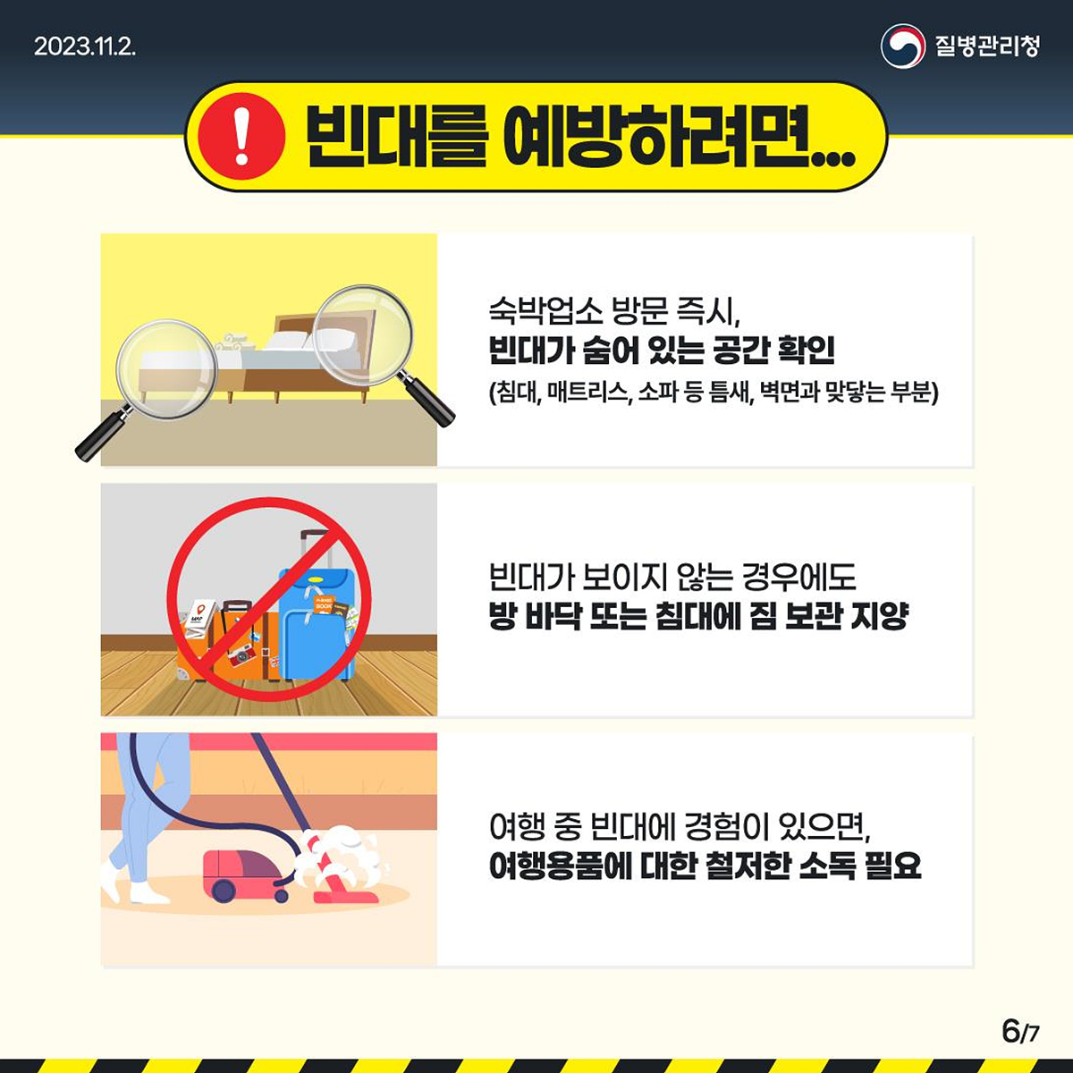 주요 빈대 관리 및 방제 방안은 ▲빈대에 물렸다면, 우선 물과 비누로 씻고 증상에 따른 치료법 및 의약품 처방을 의사 또는 약사와 상의할 것 ▲침대 모서리나 매트리스 사이 집중 확인할 것 ▲빈대를 발견하면 물리적 방제(스팀 고열 분사 및 청소기 이용) 및 화학적 방제(살충제 처리)를 동시에 진행할 것 ▲여행 중 빈대에 노출된 경험이 있으면 여행용품에 대한 소독을 철저히 할 것 등이 있다.