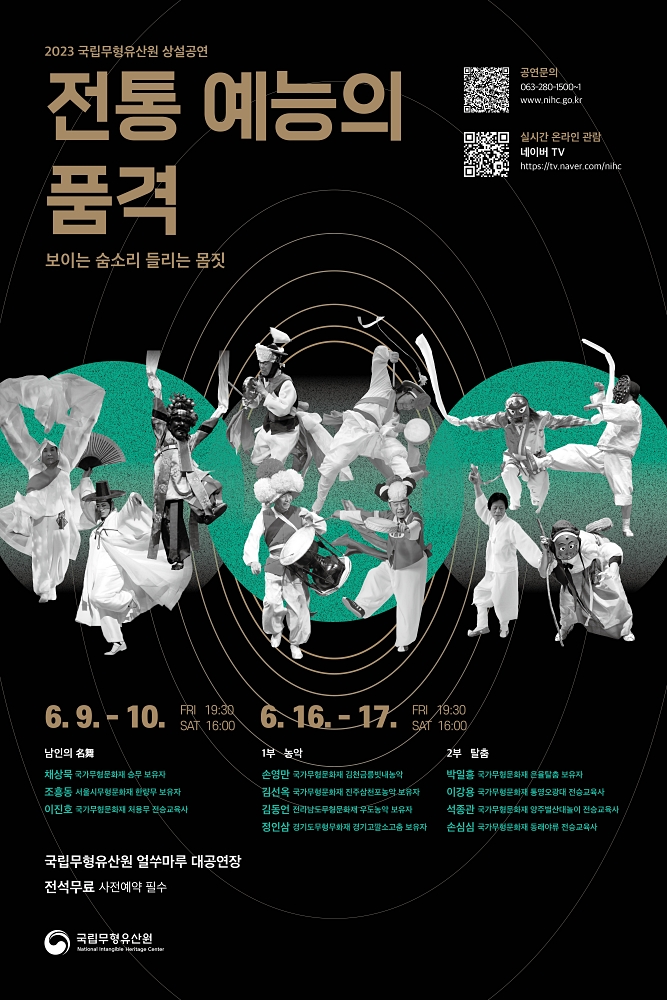 문화재청 국립무형유산원은 6월 9일부터 17일까지 2주간 금요일 오후 7시 30분과 토요일 오후 4시에 국립무형유산원(전북 전주시) 얼쑤마루 공연장에서 해설과 함께하는 「전통예능의 품격」 공연을 개최한다.