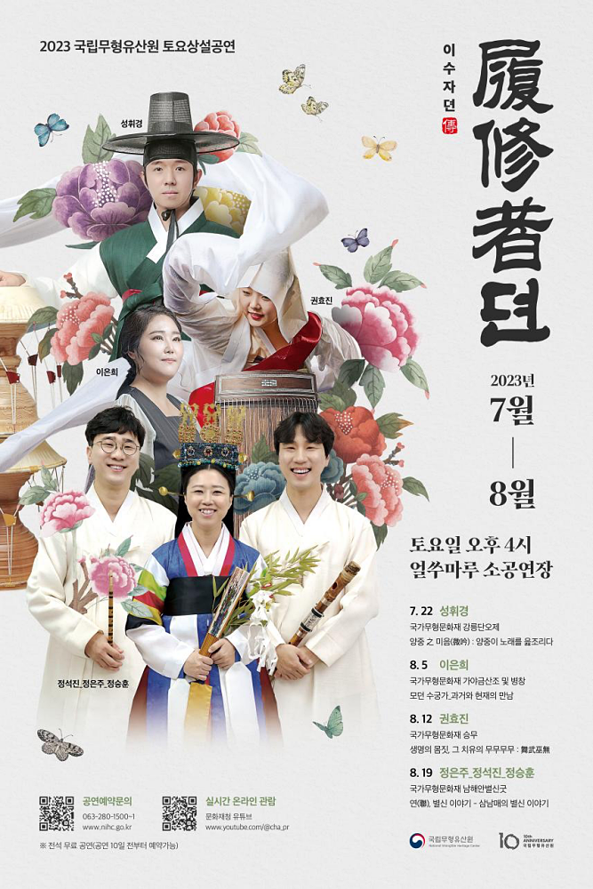 문화재청 국립무형유산원은 오는 7월 22일부터 8월 19일까지 총 4차례에 걸쳐 토요일 오후 4시 국립무형유산원(전북 전주시) 얼쑤마루 소공연장에서 ‘2023 <이수자뎐(傳)>’을 개최한다.