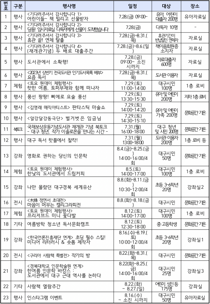7월 29일(토) 오전에는 도서관 로비 1층에서 대구시민 100명을 대상으로 캘리그라피로 토퍼부채를 만들어보는 ‘핫한 여름, 토퍼부채와 함께 떠나자’를 운영하고, 오후에는 문화공간 가온 등에서 ‘삐에로 요술풍선 배부’, ‘판타스틱 마술쇼’, ‘벌거벗은 임금님 동극 공연’이 진행된다.