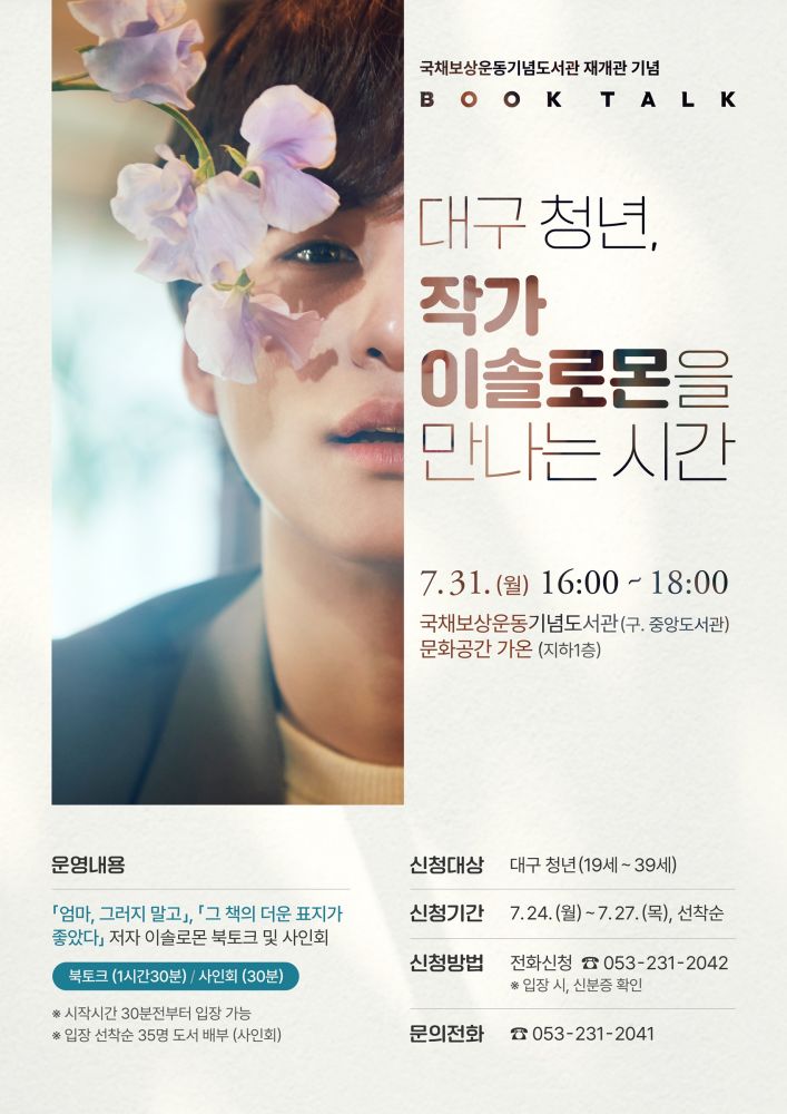 재개관식이 진행되는 7월 31일(월) 오후 4시부터는 <엄마, 그러지 말고>의 저자 이솔로몬을 초청해 작가의 인생사를 통해 청년들에게 꿈과 희망을 주고자 북토크 ‘대구 청년, 작가 이솔로몬을 만나는 시간’을 운영하고, 7월 27일(목)까지 대구 청년(19세에서 39세)은 누구나 전화(☎231-2041~2)로 신청 가능하다.