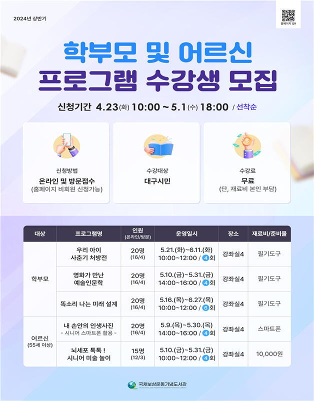 수강생은 4월 23일(화) 오전 10시부터 선착순으로 모집하며, 도서관 누리집(library.daegu.go.kr/gukbo)을 통한 온라인 신청 및 도서관 방문을 통해 신청할 수 있다. 모든 프로그램의 수강료는 무료이며, 재료비는 별도이다.