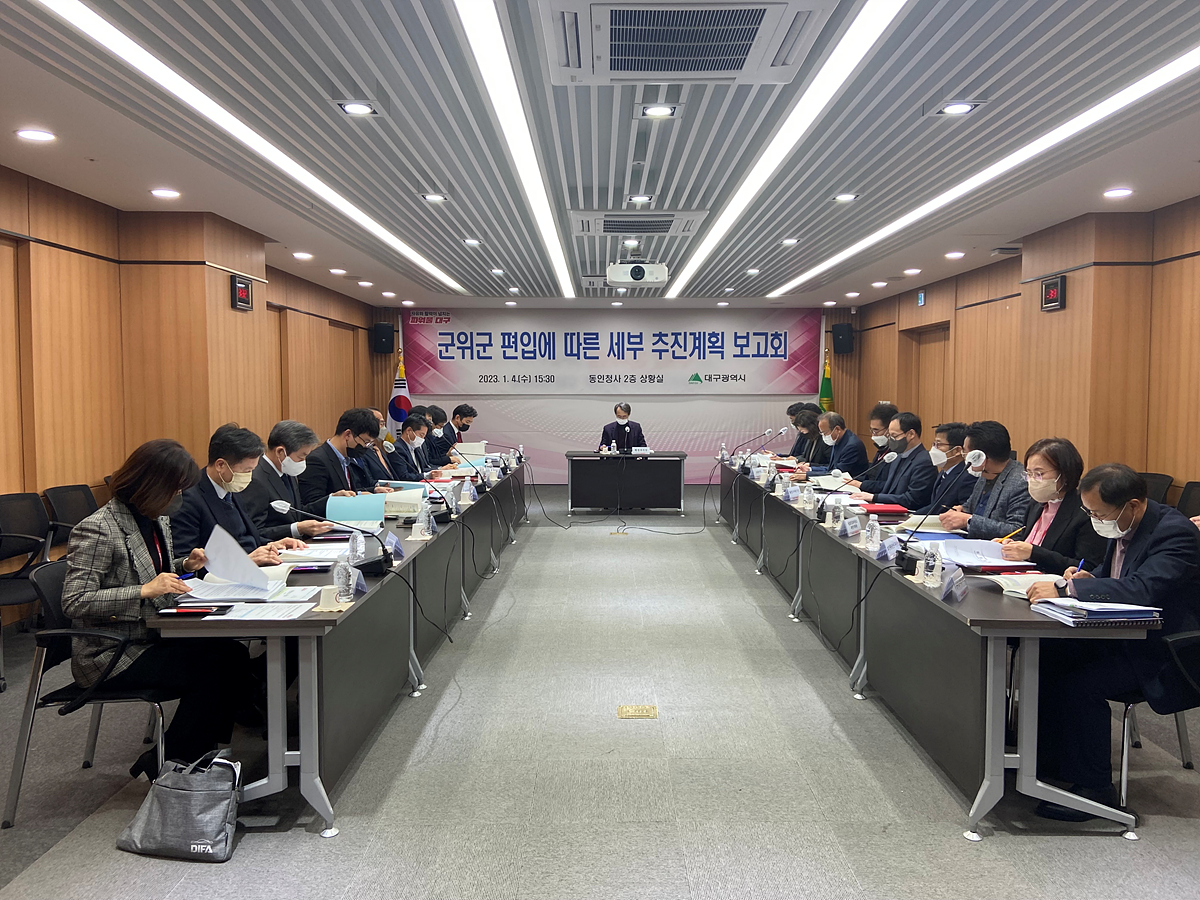 2023년 7월 1일 군위군이 대구시에 편입됨에 따라 대구시는 1월 4일(수) 오후 김종한 행정부시장 주재로 대구시청 동인청사 2층 상황실에서 군위군의 대구광역시 편입에 따른 실·국별 세부 추진계획 보고회를 개최했다.