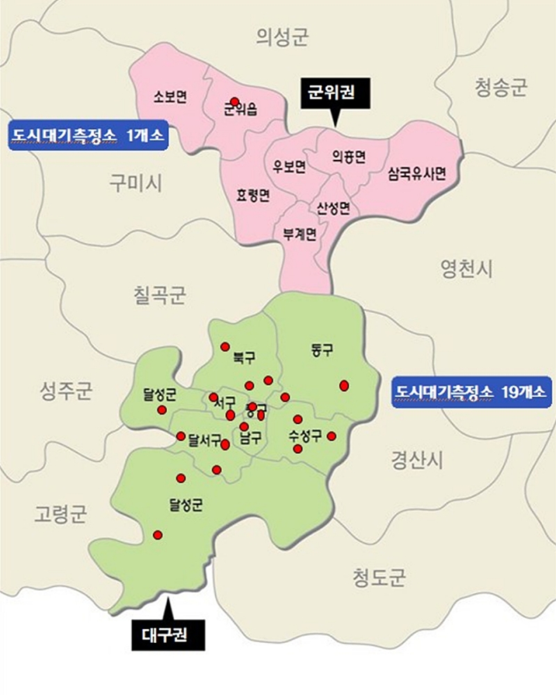 지난해 6월 환경부 국립환경과학원에서 분석한 대기오염측정소별 상관성 분석 결과와 지역 전문가 자문회의 결과, 대구광역시와 군위군의 지역적 특성, 대기오염배출원, 대기오염도 농도 차이 등을 고려해 대기오염 경보발령 권역을 최종 대구권(군위군제외), 군위권 2개 권역으로 결정하게 됐다.