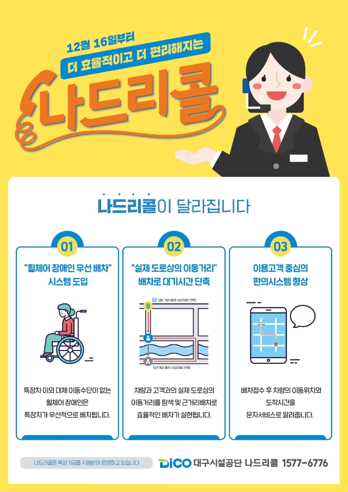 대구시설공단 나드리콜은 12월 16일(목)부터 새로운 관제시스템을 도입하고 휠체어 장애인 우선배차와 고객 편의성 개선으로 더 나은 서비스 제공에 나선다고 밝혔다.