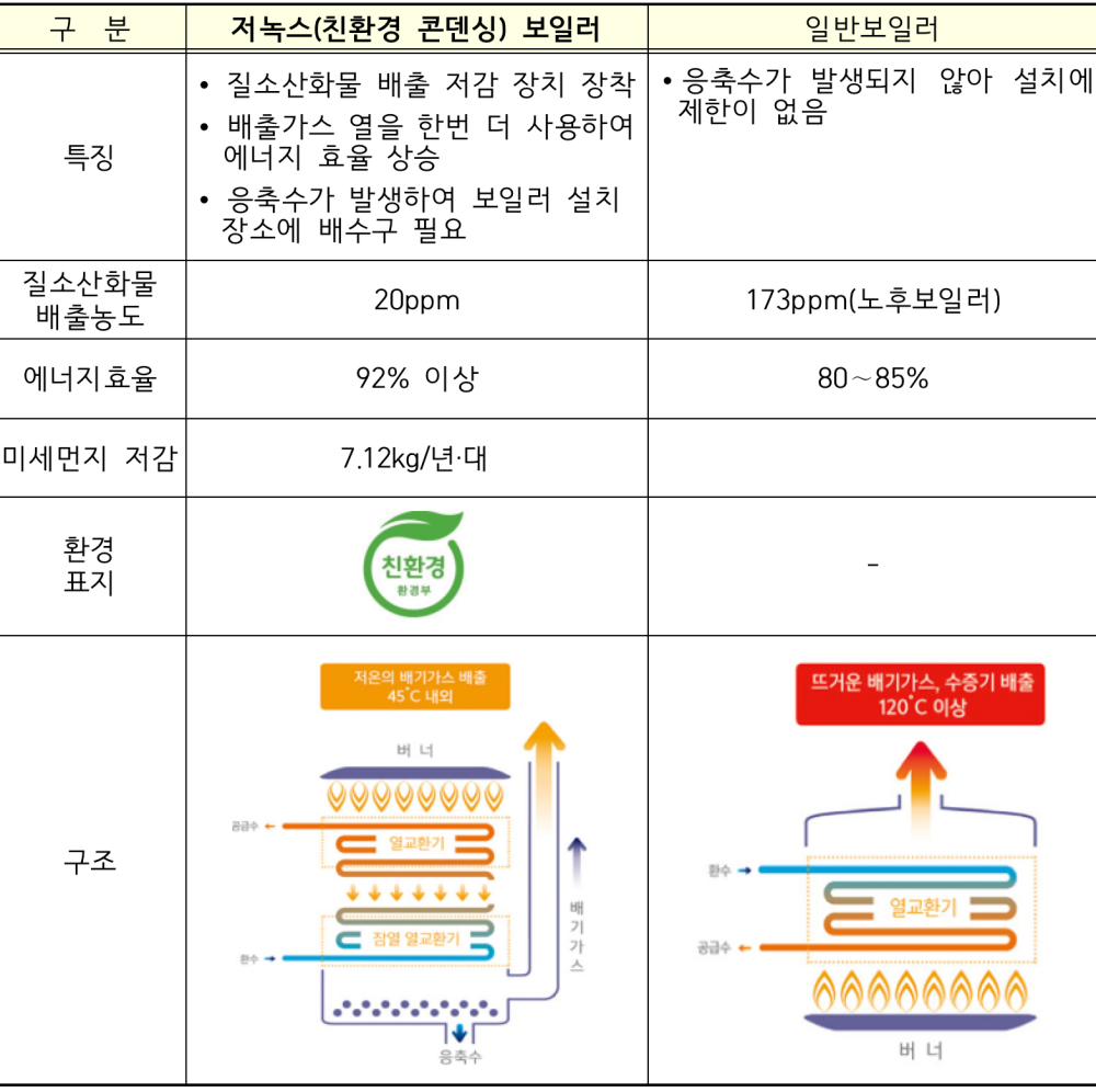저녹스 보일러는 일반 보일러보다 에너지 효율이 높아 난방비가 절약될 뿐 아니라, 초미세먼지(PM-2.5) 생성의 주요 원인물질인 질소산화물 배출량을 약 79%까지 저감시킬 수 있는 친환경 보일러이다.