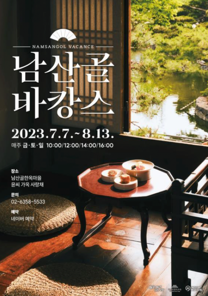 한국의 맛·멋·쉼을 모두 느낄 수 있는 <2023 남산골 바캉스>는 7월 7일(금)부터 8월 13일(일)까지 매주 금~일요일에 진행된다. 체험비용은 1인당 16,000원이며 36개월 이하는 무료 참여가 가능하다. 소규모로 운영되는 만큼 회차당 최대 4인 구성인 1팀만 예약할 수 있다. - 다만, 8월 11일은 체험을 운영하지 않으며, 12일과 13일은 약자와의 동행을 위한 특별회차로 일반 체험객은 예매 불가하다.