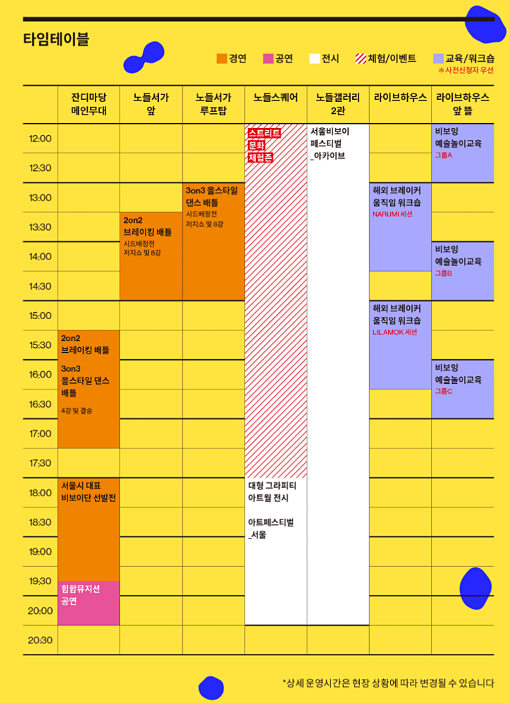‘서울시 대표 비보이단 선발전’은 본경연 외에도 저지쇼와 한국 및 일본 초청팀 간의 독창적인 움직임이 드러나는 이벤트 배틀 공연을 더해 주말 오후 노들섬을 방문한 시민들에게 다채로운 볼거리와 즐거움을 선사한다.