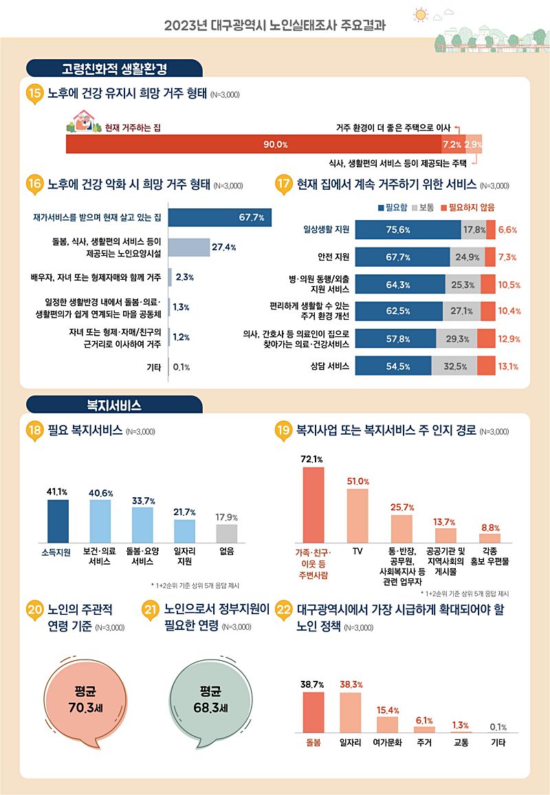 지역 노인정책에 대한 의견을 알아본 부가 조사에서 노인 스스로 생각하는 노인의 연령 기준은 평균 70.3세, 노인으로서 정부지원이 필요하다고 생각하는 연령은 평균 68.3세였으며, 대구광역시가 지난 2023년 7월 1일부터 전국 최초로 시행한 어르신 통합무임교통지원*에 대해서는 노인의 86.9%가 ‘적절하다’고 답변했다. 대구광역시에서 향후 가장 시급하게 확대되어야 할 노인정책은 돌봄(38.7%)과 일자리(38.3%)가 높은 순위를 차지했다.