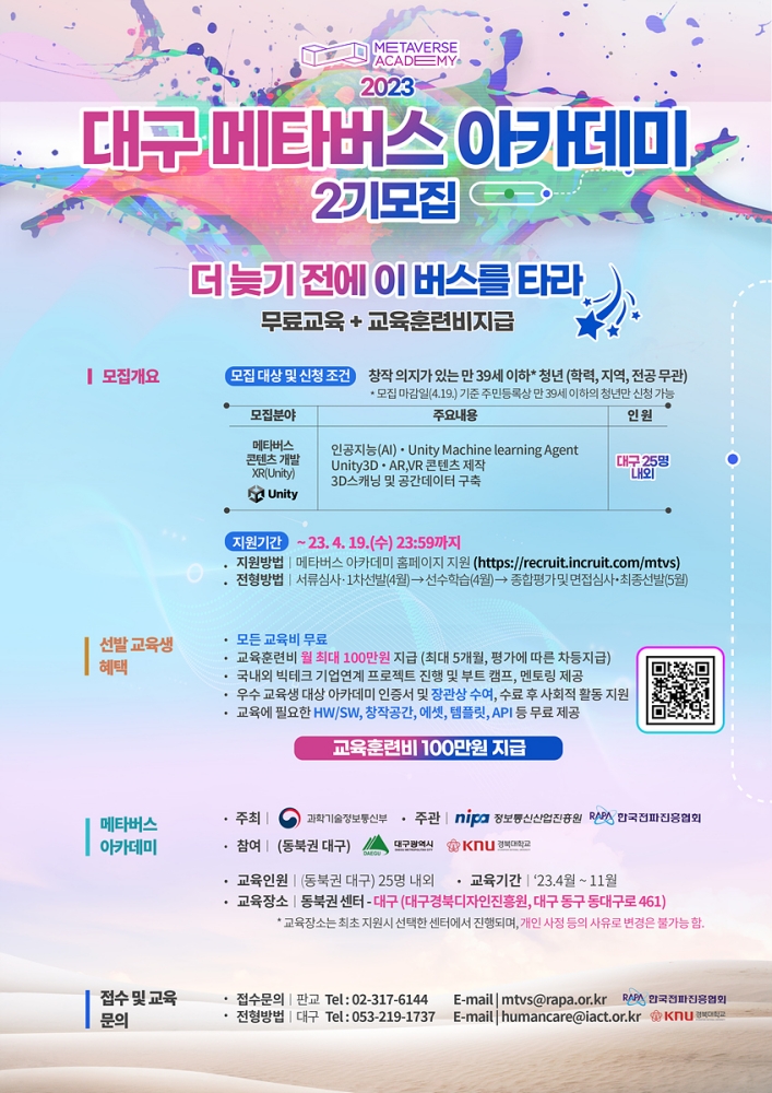 대구광역시는 메타버스(가상융합세계)*산업을 이끌어갈 청년 개발자와 창작자를 양성하기 위해 ‘가상융합세계(메타버스) 아카데미’ 참가자를 4월 19일(수)까지 공개모집 한다.