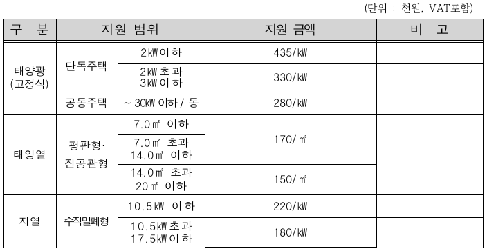 * 태양광 분야는 “저탄소모듈”을 의무 사용해야 하며, “저탄소모듈”이란 저탄소 태양광모듈 제품 지원 운영지침(산업부고시)에 의해 탄소배출량이 670kg・CO2-eq/kW 이하로 검증받아 인정서를 제출한 제품에 한하며, 해당 주택 전체에 적용한 경우에 지원단가 적용