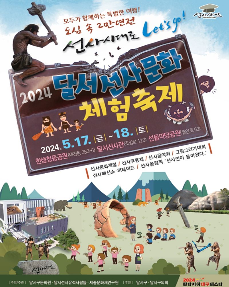 대구 달서구가 오는 5월 17일부터 18일, 이틀간 한샘청동공원과 달서선사관, 선돌마당공원에서‘모두가 함께 떠나는, 2만년전 선사시대로 여행’을 주제로‘2024 달서 선사(先史)문화체험축제’를 개최한다.
