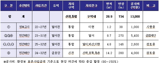 대구시는 달서천 5구역 하수관로 정비 임대형 민간투자사업(BTL)이 예비타당성 조사 면제사업에 선정됨으로써 총사업비 2,694억 원 중 국비 808억 원을 확보하게 됐고, 민선 8기 공약사업인 ‘금호강 1급수 프로젝트’의 성공적인 추진에 발판을 마련했다.