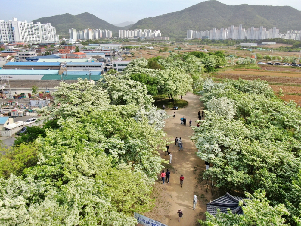 올해는 평년보다 조금 이른 4월 말에 이팝나무의 꽃이 만개 되어 군락지 전체가 하얀 눈꽃으로 장관을 연출하고 있다. 하늘에서 보면 마치 흰 구름이 땅 위에 내려앉은 것 같이 보이며, 숲길을 걸으면 마치 구름 속을 걷는 듯한 기분을 만끽할 수 있다.