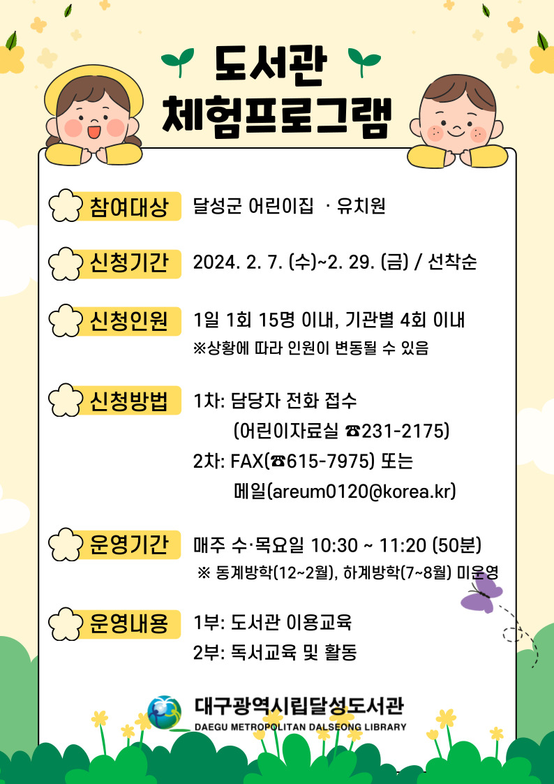 참가 신청은 2월 7일(수)부터 2월 29일(목)까지 전화 문의를 통해 담당자와 일정을 조율한 후, 제공하는 양식으로 서면 신청서를 제출하면 된다. 접수는 선착순으로 진행하며, 기타 자세한 사항은 달성도서관 어린이자료실(☎231-2175)로 문의하면 된다.